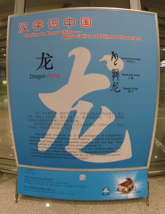 Upon arrival in Beijing Capital International Airport, I am greeted by a series of signs titled Getting to Know China — Appreciation of Chinese Characters.